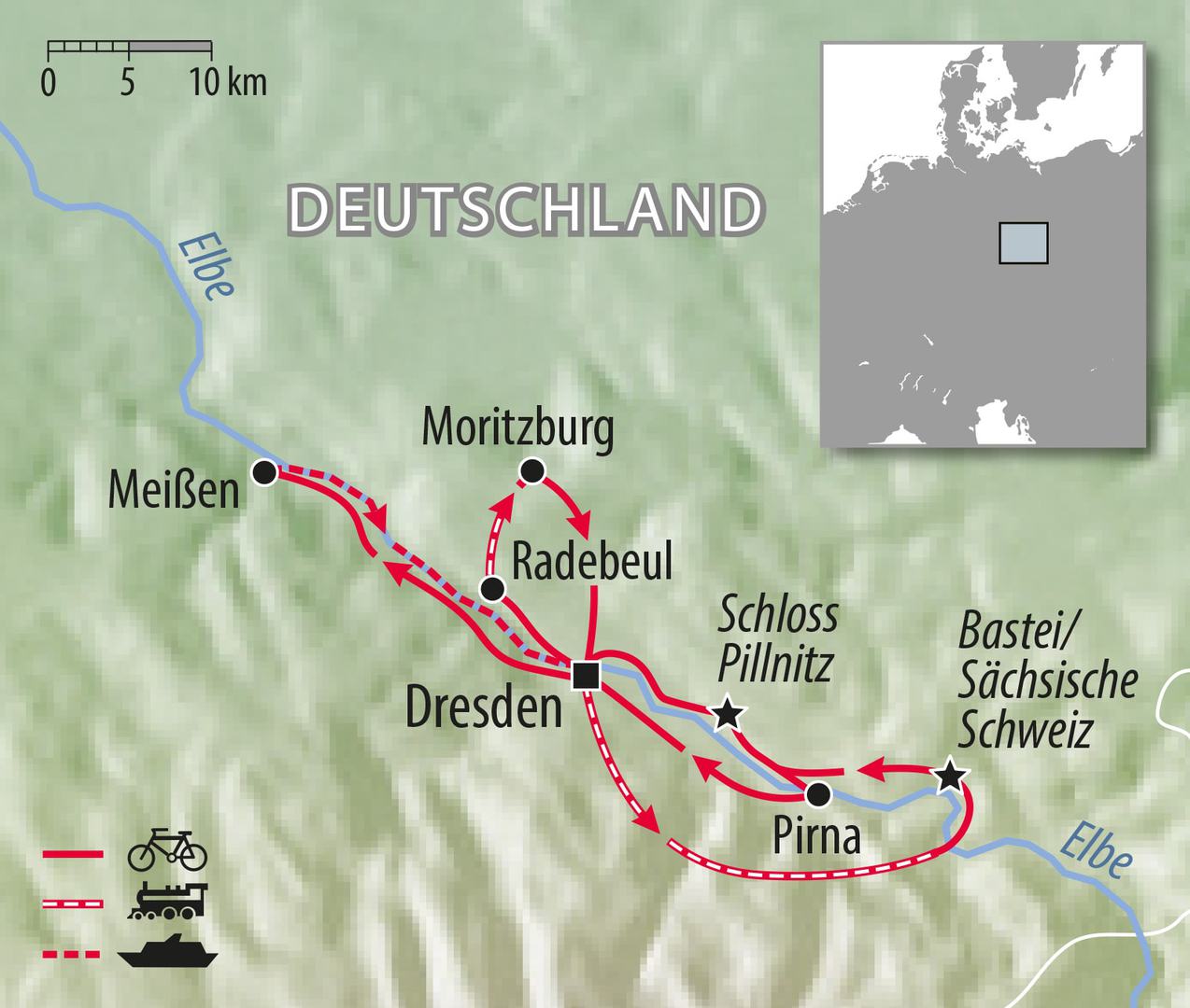 Die Stadt Dresden bietet Kurzweil für viele Tage Urlaub. Bauwerke internationalen Ranges wie der Zwinger oder die Semperoper prägen diese Stadt voller Kunst, Musik und Theater. Es lohnt es sich aber auch, die Stadtgrenzen bisweilen für Reisen ins Umland zu überqueren. Sie radeln durch wildromantische Flusstäler, sehen prächtige Schlösser, Burgen und reizvolle Altstädte. Abends kehren Sie wieder nach Dresden zurück. Ihr Hotel liegt in der Nähe von Innenstadt und Elbufer.