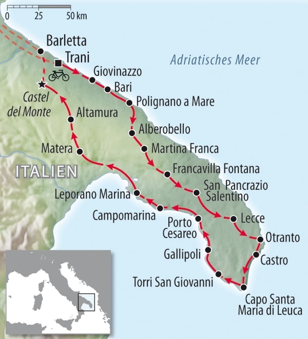 Apulien, das ist Süditalien erleben. Bei etwa 300 Sonnentagen im Jahr ist Apulien von der Sonne verwöhnt. Malerische Dörfer, einsame Felsenbuchten, verschlafene Fischerorte – der italienische Stiefelabsatz, bietet Urlaubern und Radfahrern landschaftliche und architektonische Höhepunkte: Sanft gewelltes Hügelland, uralte Olivenhaine, kleine Fischerorte, Strände mit glasklarem Wasser und vor allem den ewigen Frühling! Dazu prunkvolle Barockstädte, romanische Kathedralen, landestypische, spitzkegelige Rundbauten (italienisch: Trulli), die heute häufig auch als Ferienhaus gebucht werden können und eine Vielzahl von Kastellen, die unter der Regie des Stauferkaisers Friedrich II. entstanden. In dem bekannten Buch “Der Mann aus Apulien“ von Horst Stern wird eindrucksvoll das Wahrzeichen der Region beschrieben: das Castel del Monte, der wunderschöne Abschluss unserer großen Apulien-Rundreise. Die sehenswerte Landschaft zwischen dem Adriatischen und dem Ionischen Meer steht im Einklang mit der Freundlichkeit und Gastfreundschaft der Süditaliener! Und auch die zahlreichen Genüsse von Feld, Baum, Strauch und Rebe machen die südliche Provinz Apulien zu einem tollen Erlebnis für Radfahrer und Urlauber! Mit unserer Rundtour lernen Sie die Region einzigartig auf Ihrem Fahrrad kennen! Gibt es was schöneres?