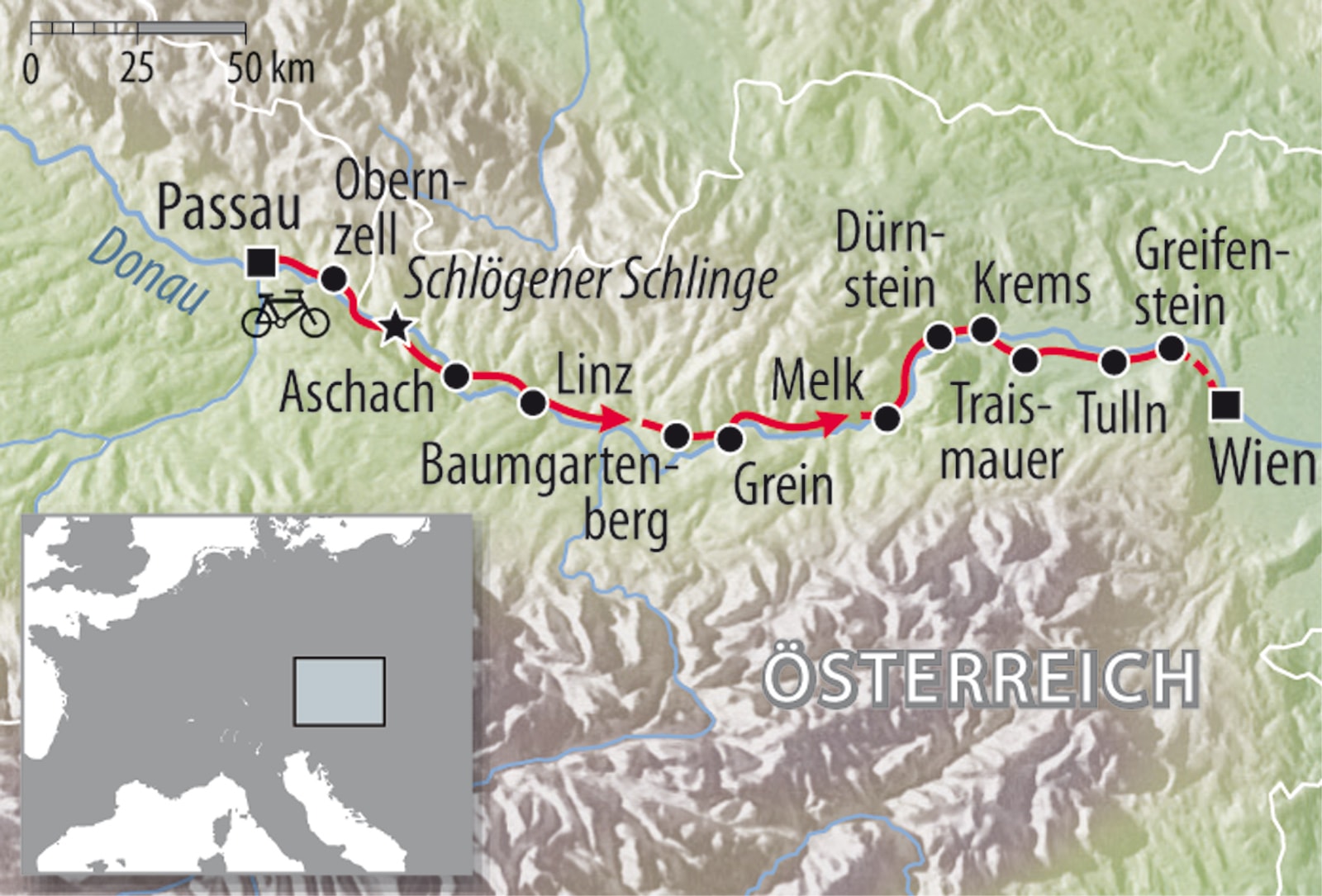 Komplett ausgebauter Radweg meist direkt entlang des Donauufers, kaum Steigungen; auch für den Radtouren-Einsteiger geeignet. Es gibt praktisch an der ganzen Strecke asphaltierte Radwege oder verkehrsarme Straßen. Gesamtlänge mit Start in Passau und Ziel Wien ca. 325 Kilometer. Sie bestimmen Geschwindigkeit und Einteilung. Die Etappen kann jeder Einsteiger gut schaffen. 95 % autofreier, ebener Radweg, 5 % Nebenstraßen und Ortsdurchfahrten.