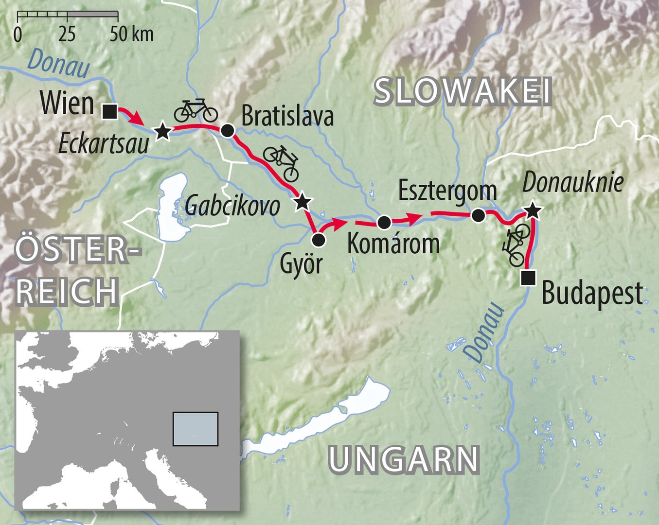 Der Donauradweg von Wien nach Budapest hat ein überwiegend flaches Streckenprofil. Daher ist diese Radreise auch für Einsteiger geeignet. Trotz der Etappenlängen stellt die Tour aber keine hohen Anforderungen an die Kondition, da genügend Zeit ist.