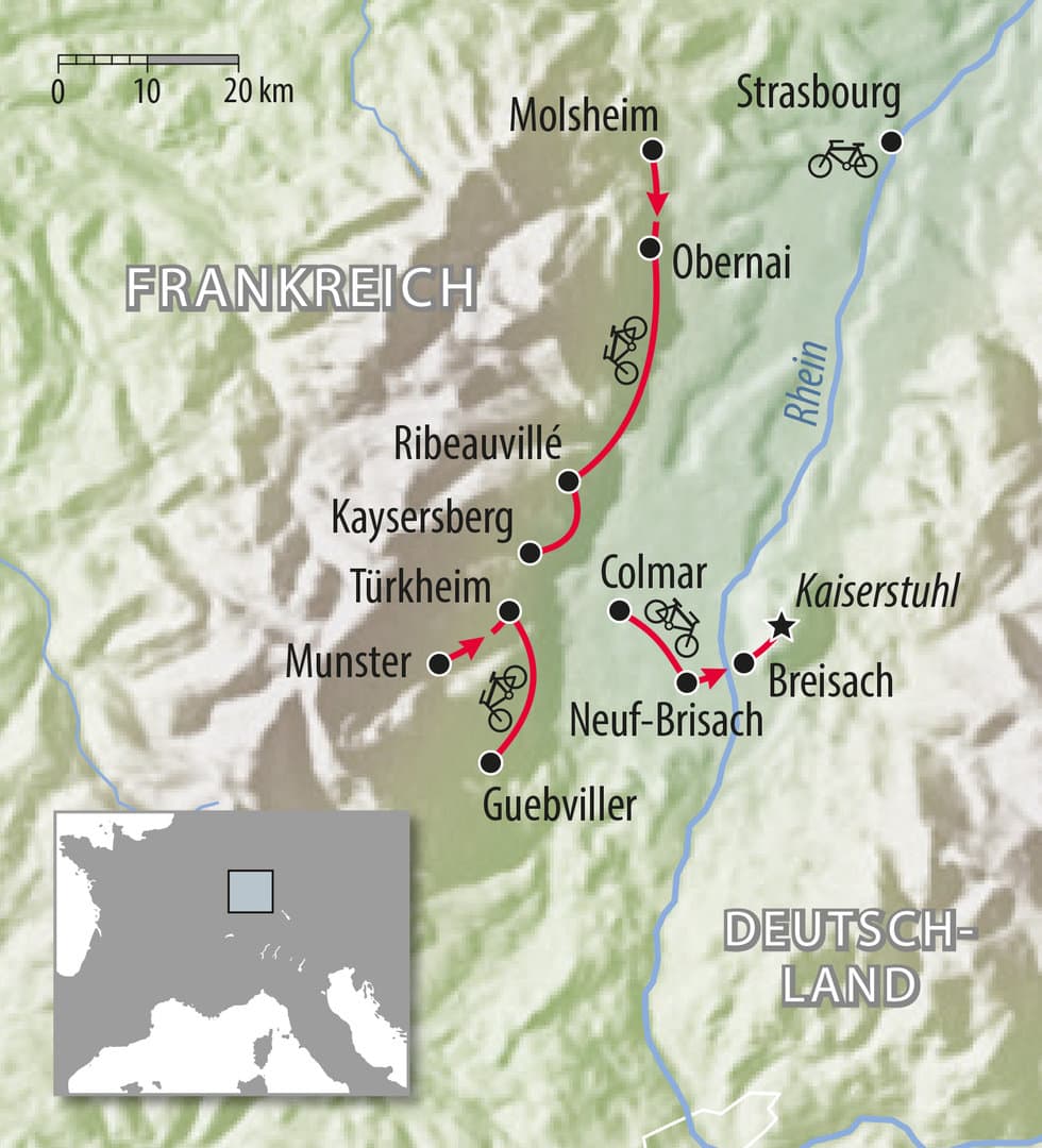 Heute starten wir zum „zweiten Elsass Radtag“ unserer Radreise Elsass und Kaiserstuhl, und erkunden das nördliche Elsass. Wir starten in Molsheim und radeln ständig auf dem EuroVelo 5, dem internationalen Radwanderfernweg, der London mit Brindisi in Italien verbindet. Hier im Elsass führt er uns durch viele sehenswerte Dörfer und Städtchen. Wir radeln u.a. durch Rosheim, Barr, Andlau, Dambach-la-Ville, Obernai, Ribeauvillé oder Hunawihr. Wir staunen über die wunderschönen Fachwerkhäuser, Kirchen, Schlösser und Burgen. Unsere Elsass Fahrradtour endet im schönen Kaysersberg, dem Geburtsort des Nobelpreisträgers Albert Schweitzer. Das Städtchen ist auch bekannt als die Storchenstadt. Denn auf vielen Häusern, hohen Masten und Kirchen sieht man Storchennester, sitzende, an- und abfliegende Störche. In der Altstadt finden sich weiterhin viele reich verzierte Fachwerkhäuser. Am späten Nachmittag bringt uns der Radbus zurück zum Hotel. (F/-/A)