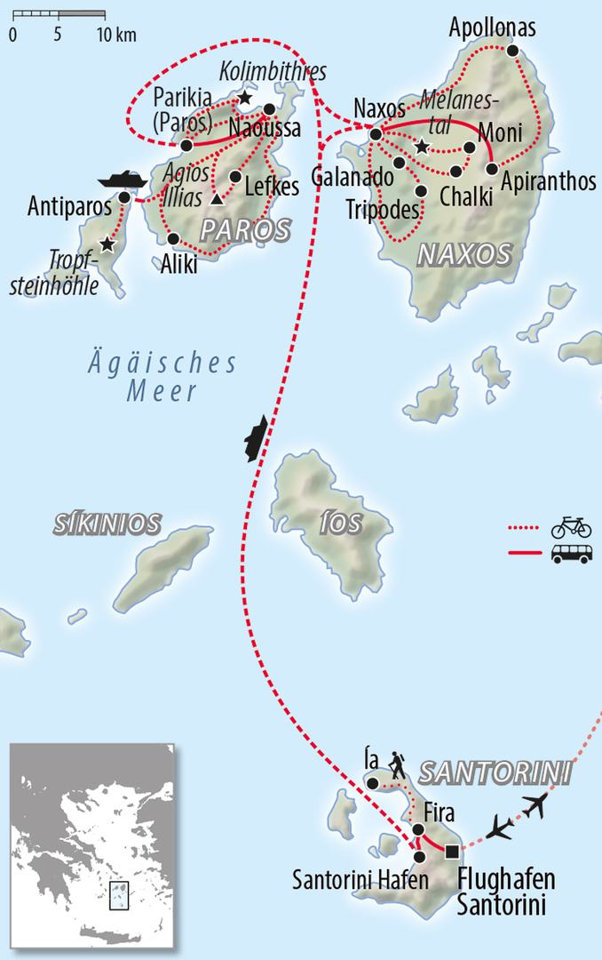Die abwechslungsreiche, fünfzehntägige Fahrrad-Erlebnisreise, ist konzipiert für unternehmungslustige Radwanderer, die ohne Hektik Griechenland von seiner schönsten Seite erleben wollen. Auf sieben Radtouren und einer Wanderung erkunden wir die Inseln Paros, Naxos, Antiparos und Santorini. Wir radeln auf verkehrsarmen Nebenstrecken sowie idyllischen Strand- und Feldwegen mit sehr guten Rädern durch atemberaubende Landschaften, entdecken bekannte und versteckte Sehenswürdigkeiten, und haben viel Zeit für lange Badepausen. Das Gelände ist manchmal hügelig, doch haben wir bei der Auswahl der Basisrouten lange Anstiege vermieden. Ein Kleinbus mit Fahrradanhänger begleitet die Gruppe auf den Touren. So können weniger trainierte Radler, je nach Lust und Laune, kurze, steile Anstiege bequem überbrücken. Für sportlich orientierte Biker wird eine weitere Tour angeboten; außerdem können alle Touren individuell verlängert werden, da immer zwei Guides die Gruppe begleiten. Eine Kraterwanderung auf Santorin, gekrönt von spektakulären Ausblicken, rundet unser Programm ab.