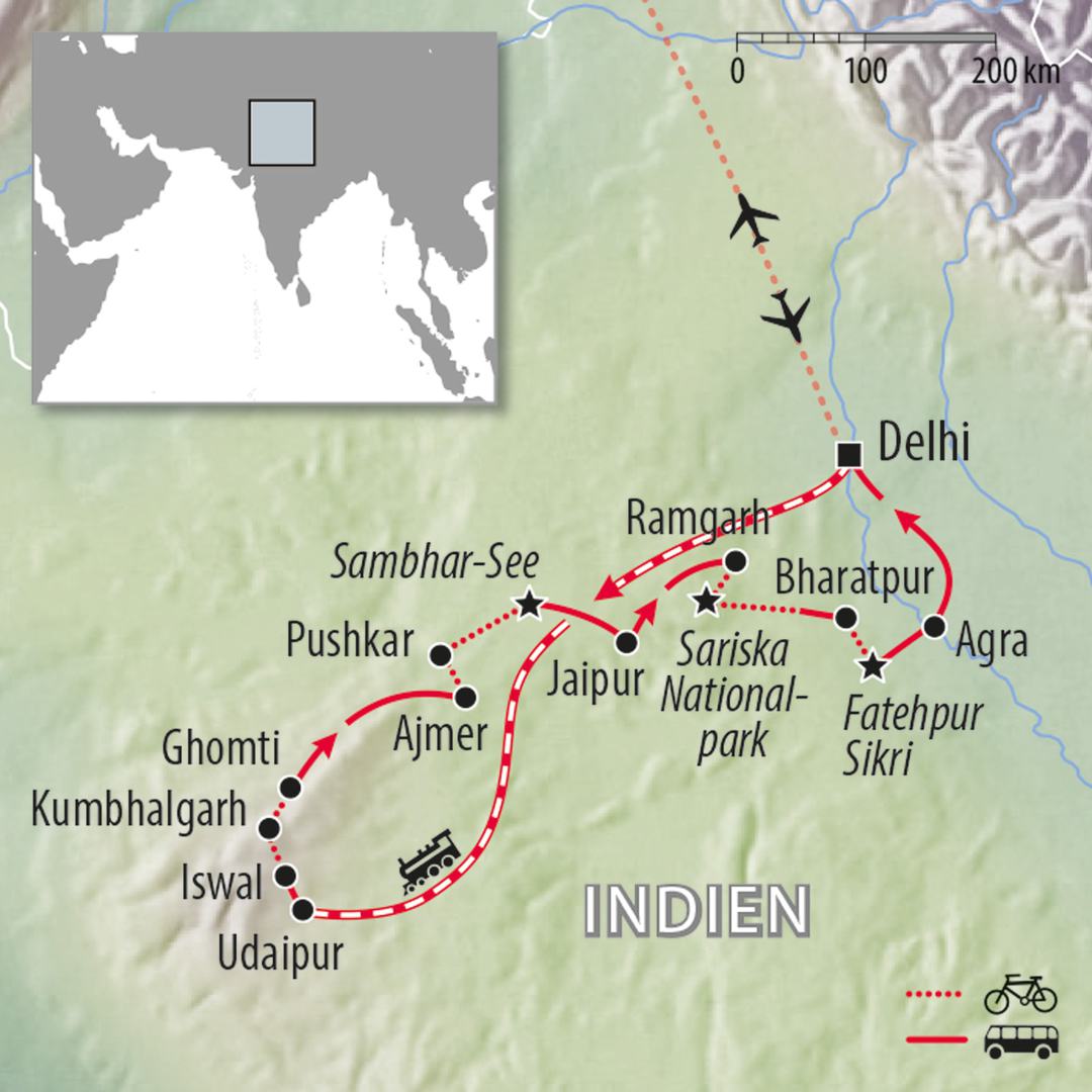 Radurlaub in Indien von Udaipur zum Taj Mahal. Rajasthan hat Landschaften, die von grünen Hügeln bis hin zu unfruchtbaren und sonnenverwöhnten Wüsten variieren. Es finden sich im ganzen Staat Festungen – Forts genannt – deren Zinnen über der Landschaft thronen. Rajasthan ist ein Teil Indiens, der sich durch seiner Farbenpracht und seiner Lebendigkeit Indien so präsentiert, wie es sich der Reisende vorstellt. Die Schönheit fasziniert Reisende bereits seit Jahrunderten. Die Landschaft ist geprägt von Dörfern und Städten so wie von authentischem ländlichem Leben. Jeder Ort – jede Region hat seine eigene Geschichte einer sehr stolzen Hochkultur zu erzählen. Radfahren ist der perfekte Weg, um Rajasthan zu erkunden und bietet einen faszinierenden Einblick in die traditionelle Lebensweise. Sowohl die Städte als auch die Landschaften bei ausgedehnten Radtouren lassen sich so viel besser erfahren wie bei klassischen Rundreisen. Erleben Sie eine Fahrradtour durch faszinierende Landschaften, mit zahlreichen kulturellen Highlights und einem Feuerwerk an Farben, Gerüchen und Genüssen.