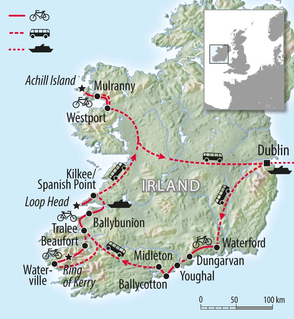 Mittelschwere Radtour, die für jedermann machbar ist. Es sind jedoch einige Anstiege und etliche Höhenmeter zu bewältigen. Nähere Angaben zu den Streckenlängen und Höhenmetern finden sich bei den jeweiligen Tagesbeschreibungen. Unsere Radrouten folgen zumeist auf kleinen Nebenstraßen. Typisch für Irland sind Single Track Roads: kleine, einspurige Straßen mit zahlreichen Ausweichstellen und wenig bis ganz wenig Verkehr. Die Streckenführung dieser kleinen Sträßchen passt sich zumeist dem Gelände an und ist daher oftmals hügelig. Teilweise sind die Straßen so eng und schmal, dass uns der Bus über längere Strecken nicht begleiten kann, d.h., er wird nicht immer in der Nähe sein.