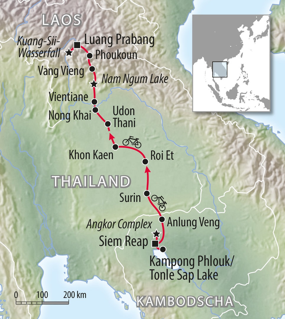 Diese Radtour durch Kambodscha, Thailand und Laos beginnt in Angkor in Kambodscha, führt durch den östlichen Teil Thailands und endet in Luang Prabang, der Weltkulturerbstätte. Wir beginnen unsere Radtour mit der Besichtigung des Angkor-Komplexes und der ehemaligen Hochburg der Roten Khmer und fahren dann weiter nach Surin. Von dort aus besuchen wir das berühmte Elefanten-Dorf und radeln durch den schönsten ländlichen Teil Thailands, um die Landschaft, die endlosen Zuckerrohrfarmen und Casava (Maniok) zu genießen.