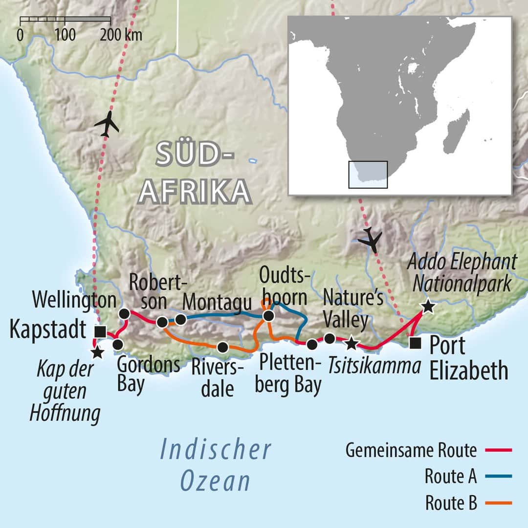 Der Südwesten Südafrikas besticht durch seine atemberaubende Vielfalt. Nach einer Safari im mittlerweile zweitgrößten Nationalpark Südafrikas, dem Addo Elephant Nationalpark führt diese Radreise Südafrika durch Urwälder und an der wilden Felsküste der Gardenroute entlang. Über die Outeniquaberge geht es in die Steppe der Kleinen Karoo, dem Zentrum der Straußenzucht. Einsame Täler, blühende Sukkulenten, charmante Dörfer und spektakuläre Fernsichten prägen die Landschaft. In der Weingegend trifft die einzigartige Vegetation des Pflanzenkönigreich Capensis auf kultivierte Lebensart. Die Kap-Holländische Architektur hat hier ihre größte Entfaltung erfahren. Kapstadt besticht durch seine großartige Lage am Fuße des Tafelbergs. Die multikulturelle Stadt am Ende des Kontinents bietet interessante Wanderungen und wunderschöne Radstrecken auf beiden Seiten der Kap Halbinsel an. Auf dieser Radreise verwöhnt sie unser Chef ein paar Mal mit reichhaltigen und gesunden Mahlzeiten aus der bunten Vielfalt der südafrikanischen Küche.
