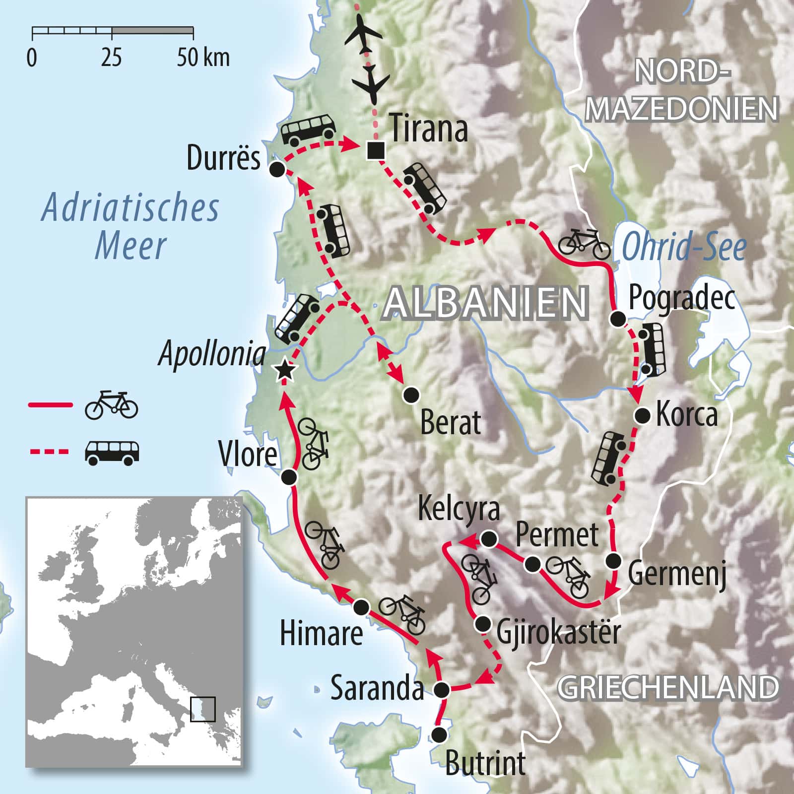 Tauchen Sie ein in das Land der Skipetaren, wie sich die Albaner selbst gerne nennen, das in der Vergangenheit des Balkans eine bedeutende Rolle gespielt hat, dann lange vergessen war und heute wieder den Anschluss an Europa sucht und findet. Die vielen architektonisch einzigartigen Bergketten, Schluchten, Flüsse und Täler. Auch die von der UNESCO geschützten Städte und Bauwerke sprechen von der bewegten Geschichte dieses Landes. Durch die flache Adria-Meerküste mit 250km Länge und die süd-ionische-Meeres Riviera wird diese Radtour unvergesslich.