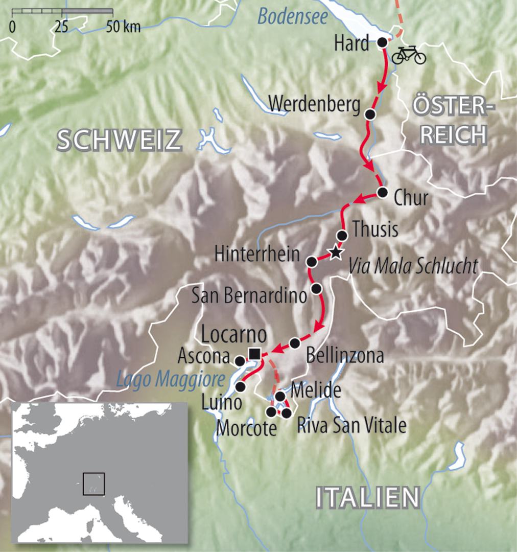Das Rheintal auf einem flachen best ausgebauten Radweg hinauf – vom San Bernardino hinunter – so einfach kann Radfahren sein. Erleben Sie auf dieser Tour die Schweiz von ihrer schönsten Seite. Bereits der Bodensee ist eine schöne Urlaubsregion. Ob “Schwäbischer Bodensee”, “Bayerischer Bodensee”, “Österreichischer” oder auch “Schweizer Bodensee”. Der Bodensee ist bereits ein Reiseziel für sich. Das bereits hier milde Klima wird uns hoffentlich das Rheintal hinauf – hier spricht man vom Alpenrhein – begleiten. Nach der Überquerung des San Bernardinos (mit unserem Bus) werden wir im Tessin bereits mit mediterranem Klima empfangen. Freuen Sie sich auf eine Radtour mit verschiedenen Klimazonen – freuen Sie sich auf eine grandiose Seen- und Bergwelt. Das ist eben die Schweiz.
