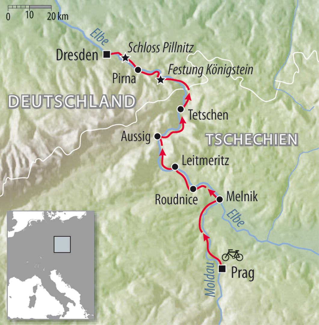 Das imposante Prag steht am Anfang der Reise, voller Geschichte, gespickt mit Sehenswürdigkeiten, gefärbt durch Lebensfreude. Dresden bildet den Schlusspunkt: Zwinger, Semperoper und Frauenkirche buhlen um Ihre Gunst. Zwischen den Städten radeln Sie auf Wegen entlang der Moldau und Elbe, besuchen kleine, hübsch restaurierte Orte und Dörfer, durchqueren romantische Flusslandschaften. Der Basteifelsen bietet Ihnen einen weiten Blick über das Elbtal, auf bizarre Tafelberge und eindrucksvolle Naturlandschaft.