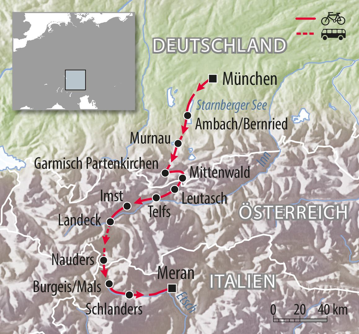 Der Titel verrät es ja bereits… Bei dieser traumhaften Radreise, ausgehend von der bayerischen Landeshauptstadt über den Reschenpass bis in die Kurstadt Meran, kommen auch weniger geübte Fahrradfahrer gut über die Alpen. Herrliche Ausblicke begleiten Sie am Weg entlang des malerischen Starnberger Sees. Die historische Lüftlmalerei an den Häuserfassaden in Garmisch-Partenkirchen und Mittenwald wird Sie begeistern. Staunen lassen werden Sie die Ausblicke auf Zugsspitze, Karwendel und Ortler. Und ein Lächeln auf die Lippen zaubert Ihnen der bestens ausgebaute Radweg in Südtirol. Spätestens in Meran werden Sie uns Zustimmen, so vielfältig und gemütlich kann also eine Alpenüberquerung sein.
