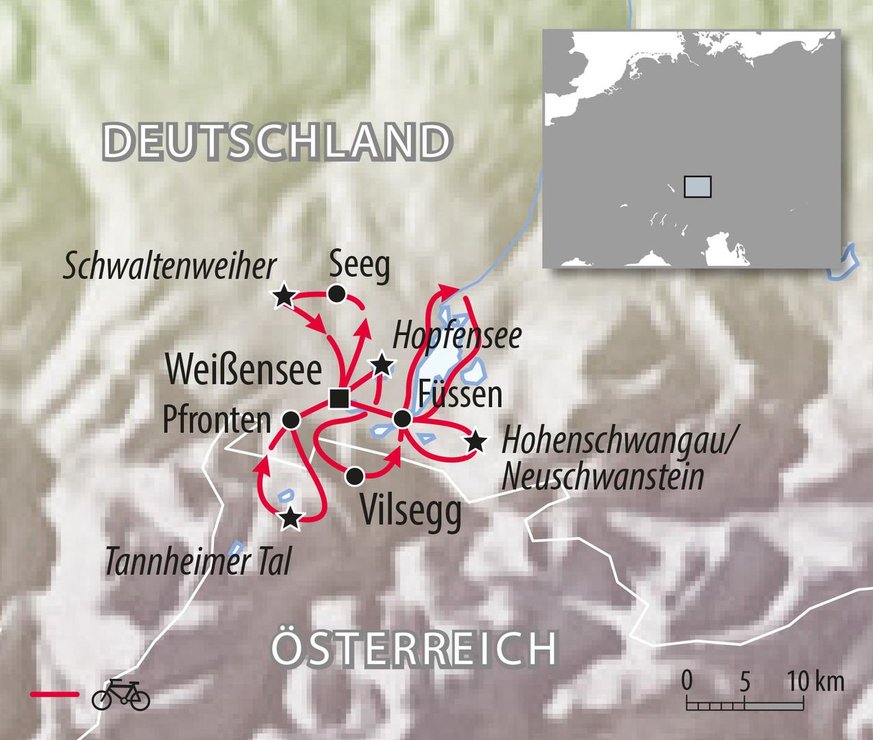 Vom Weißensee radeln Sie zunächst zum Hopfensee mit seiner Burgruine. Die nächsten Höhepunkte erwarten Sie mit dem Schloss zu Hopferau und der Wallfahrtskirche Mariahilf. Mit Blick auf Deutschlands höchstgelegener Burganlage, der Burgruine Falkenstein geht es weiter durch das Tiroler Vilstal vorbei an der Burgruine Vilsegg. Am Rückweg radeln Sie auf dem Lechradweg Richtung Füssen und zurück in Ihr Hotel.