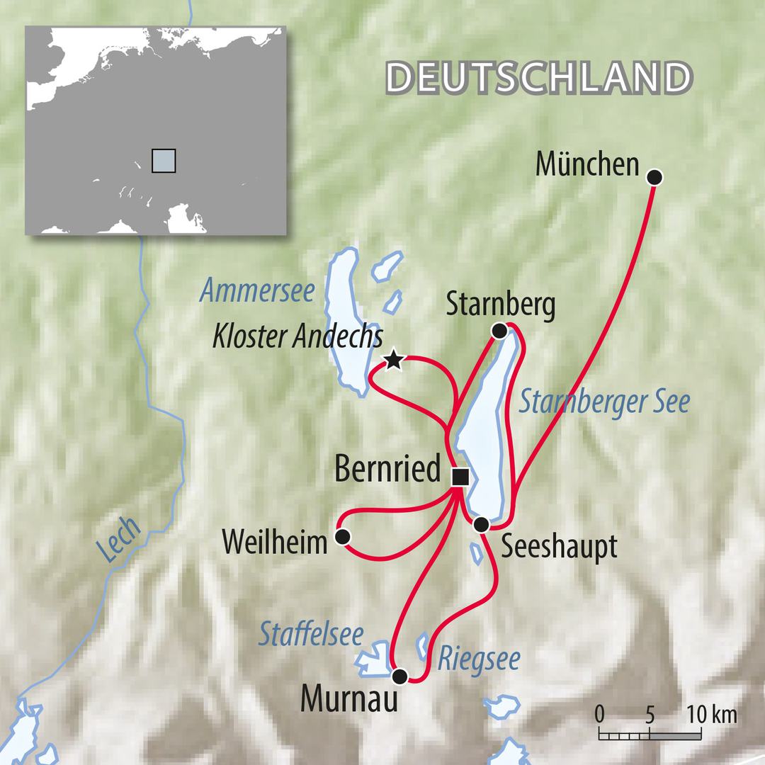 Die erste Etappe führt Sie von Bernried aus durch den bekannte Pfaffenwinkel nach München zum Ammersee. In der zweiten Hälfte des Radurlaubs radeln Sie dann einmal rund um den Starnberger See. Jede der insgesamt sechs Nächte verbringen Sie im Drei-Sterne-Hotel Seeblick bei der Familie Sailer/Lütjohann. Neben der ausgezeichneten Lage lockt das Hotel mit einem hauseigenen Hallenbad und Saunabereich, nur wenige Schritte vom See entfernt. Gönnen Sie sich Erholungsphasen auf der Radreise! Ihr Körper wird es Ihnen danken.