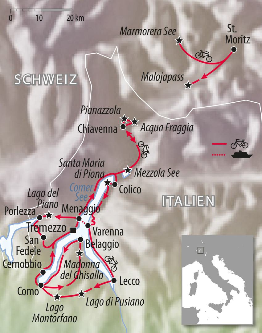 Der Comer See liegt in der Lombardei, einer Region im Norden Italiens. Er ist der See für die Reichen, für die Dichter und für die, die herrliche und reizvolle Landschaften lieben. An der Unterseite des südwestlichen Arms befindet sich die Stadt Como mit ihren Renaissancebauten und einer Standseilbahn, die zum Bergdorf Brunate hinauffährt. Lassen Sie Ihre Blicke über das Wasser des Sees schweifen. Überall finden Sie bezaubernde Winkel, kleine Buchten, herrliche Seitentäler und natürlich blühende Gärten. Von unserem Hotelstandort haben Sie einen der schönsten Blicke auf den See und auf die Halbinsel Bellagio. Sie werden von den alten, an Geschichte reichen Orten, den kleinen Kirchen und Klöstern an Berghängen, den wunderschönen historisch bedeutenden Villen fasziniert sein. Lassen Sie sich von unserer Rennradreise an einen der schönsten Plätze Italiens verzaubern. Dazu genießen Sie eine imposante Bergwelt mit schneebedeckten Gipfeln in der Schweiz mit St. Moritz und erleben die Kontraste am See mit Palmen und Zitrusfrüchten. Eine Woche die Tour” Rennrad Comer See” ist Radurlaub zum Seele baumeln lassen….