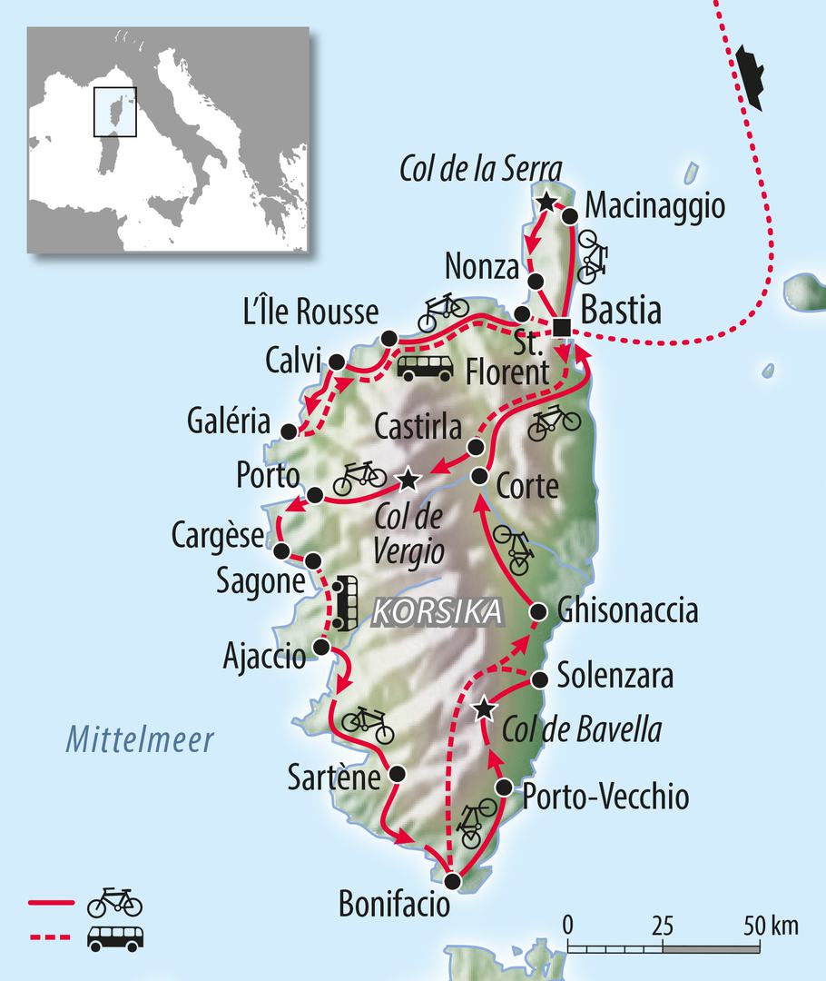 Korsika wird von den Franzosen „l’île de beauté“ genannt (Insel der Schönheit)“. Korsika (französisch Corse) ist eine zum großen Teil aus einem Hochgebirge, mit Bergen von über 2700m bestehende Insel im Mittelmeer. Politisch ist sie eine Gebietskörperschaft Frankreichs mit Sonderstatus. Die Landschaft ist sehr abwechslungsreich. Die Insel bietet hochalpine Regionen, duftende Kiefernwälder, Gebirgsseen, Hügellandschaften bedeckt mit Macchia, schroffe felsige Küstenabschnitte und Meeresbuchten mit glasklarem Wasser sowie Sandstrände an. Es gibt zahlreiche kleine Straßen mit wenig Verkehr, ideal zum Radfahren.