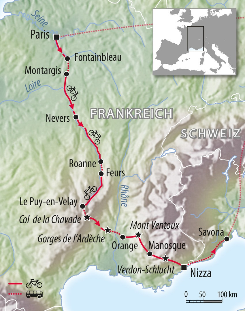 Frankreich bietet neben den bekannten Regionen viele unbekannte Schätze. Auf dem Weg an das Mittelmeer fahren wir an Flüssen und Kanälen, sehen Schlösser, Burgen und schöne Landschaften. Im Zentralmassiv erwarten uns besondere Herausforderungen bei vielen kurzen und langen Steigungen, viel Natur und spektakuläre Schluchten, die “Gorges de l´Ardèche. Über den Mont Ventoux geht es durch die Provence zu der traumhaften Verdon Schlucht. Wir erreichen unser Ziel bei Nizza und das Mittelmeer.