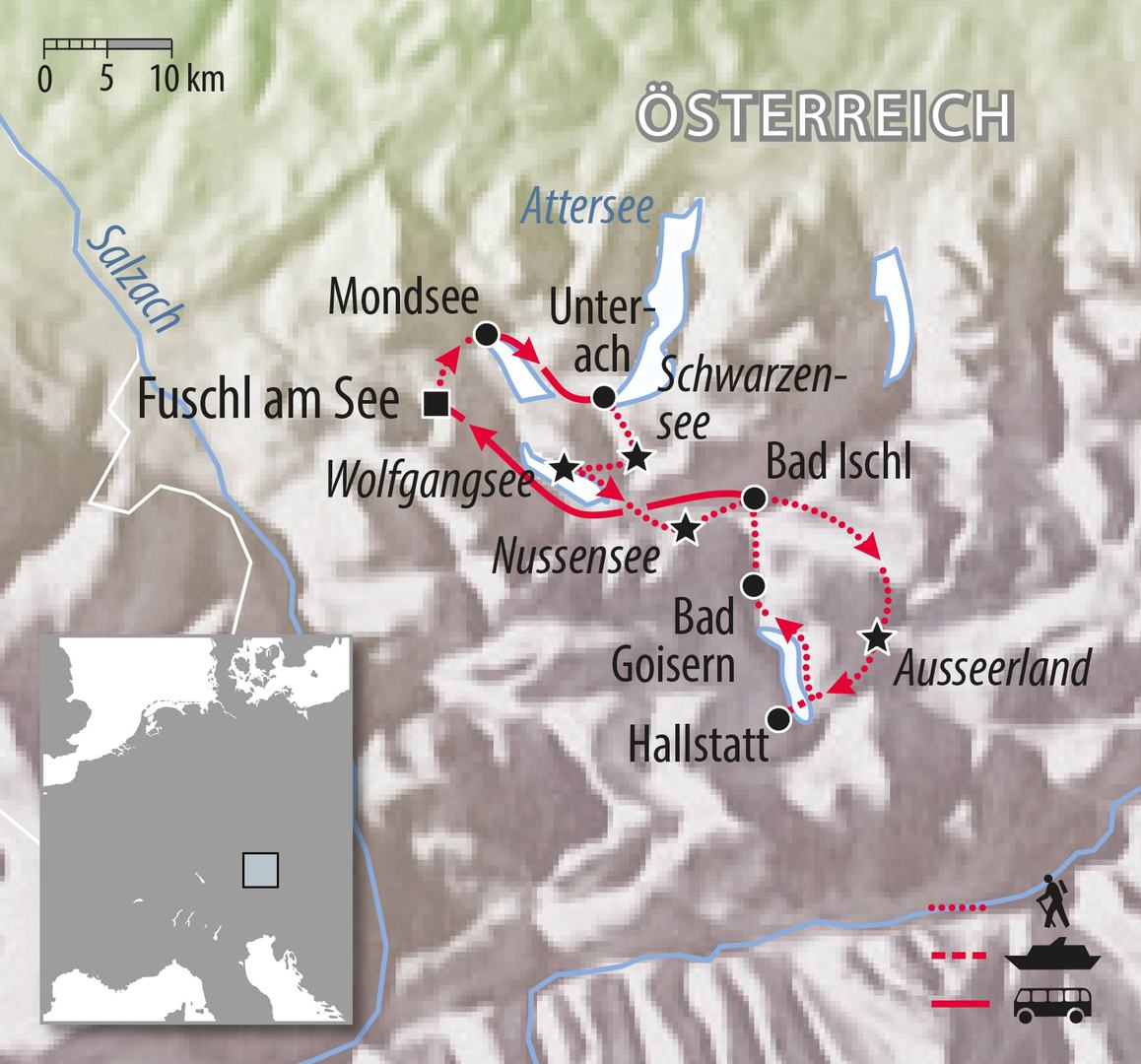 Genießen Sie atemberaubende Naturkulissen und lassen Sie sich verzaubern von sattgrünen Almwiesen, märchenhaften Wäldern und kulinarischen Köstlichkeiten. Das Salzkammergut – malerische Ortschaften mit idyllischen Seen, umringt von atemberaubender Berglandschaft. Auf dieser Wanderreise lernen Sie die österreichische Geschichte und Kultur in ihrer schönsten Form kennen. Erkunden Sie die schönsten Ortschaften am glitzernden Wolfgangsee: St. Wolfgang, St. Gilgen und Strobl. Später führt Sie der Weg weiter nach Bad Ischl und Bad Goisern, bis Sie schließlich im geschichtsträchtigen Hallstatt ankommen. Auch der Hallstätter See lädt mit seinem glasklaren Wasser an warmen Sommertagen zum Abkühlen ein.