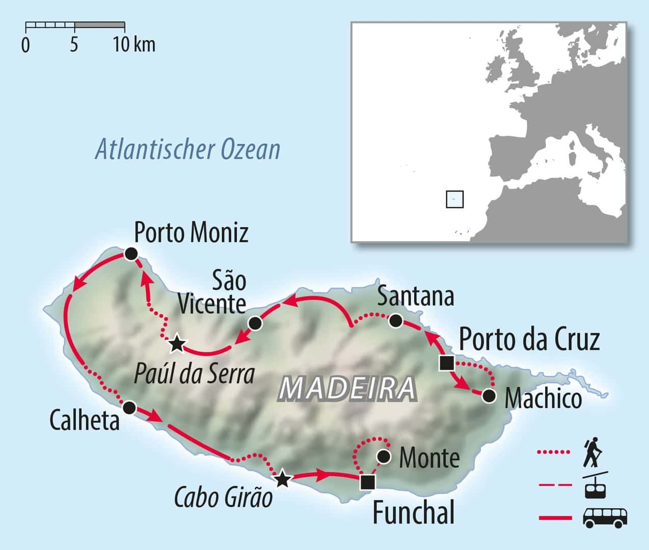 • Rückreise per Bus von Funchal zum Flughafen in ca. 1 Stunde. Fahrt per Taxi ca. € 30,- Fahrzeit ca. 30 Minuten