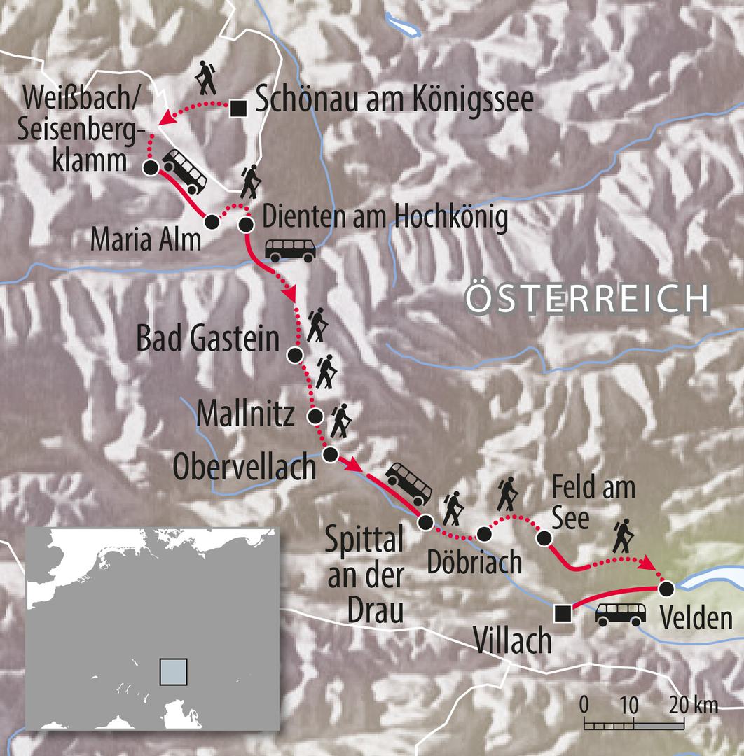 Ein lohnenswertes Naturerlebnis für Bergwanderer verspricht unsere Wandertour vom Königsee zum Wörthersee. Entlang der gesamten Route von Deutschland bis nach Österreich begleiten Sie herrliche Seengebiete, regionaler Almgenuss und traumhafte Wandermomente wie im Bilderbuch. Vom Watzmann am Königssee brechen Sie zu einer eindrucksvollen Alpenüberquerung auf. Im Nationalpark Berchtesgaden wandern Sie durch die Steinberge in den Salzburger Pinzgau und über grüne Weideflächen Richtung eindrucksvolles Gebirgsmassiv des Hochkönigs. Über das grüne Gasteinertal erreichen Sie die mächtige Gebirgskette der Hohen Tauern – Bergwandern wie im Bilderbuch. Ein uralter Passübergang führt Sie schließlich nach Kärnten, wo im Nationalpark Hohe Tauern eindrucksvolle Schluchten den Weg ins Mölltal weisen. Vorbei an unzähligen Seen, einer einladender als der andere, entdecken Sie das Wanderparadies rund um die Nockberge, bevor Sie die türkisgrünen Wogen des Wörthersees in Empfang nehmen.