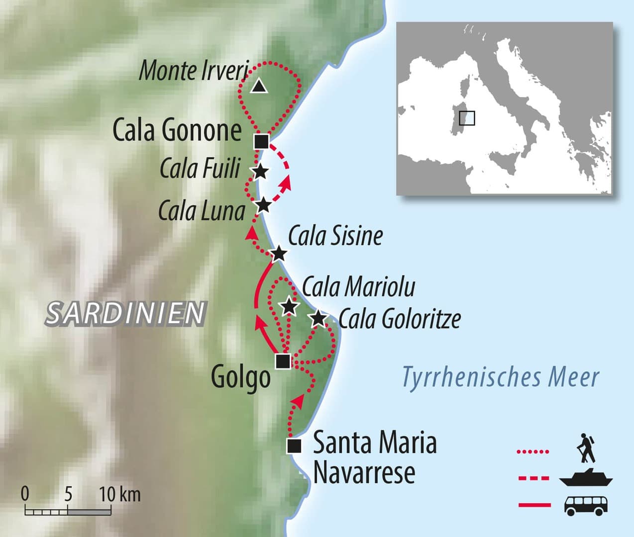 Am Tag der eigenen Anreise nach Santa Maria Navarrese sollten Sie sich Zeit für einen Besuch in den nahegelegenen Buchten der Ogliastra nehmen. Genießen Sie die Sonne und das Meer, gepaart mit Wandertouren zwischen neun und 18 Kilometern. Drei Rundwanderungen führen auch ins Hochland Sardiniens. Die Wanderwege führen oftmals über felsiges und steiniges Gelände und erfordern daher eine gute Trittsicherheit. Damit Sie für Ihre Wanderwoche auf Sardinien gut vorbereitet sind, steht umfassendes Kartenmaterial und ausführliche Reiseunterlagen zur Verfügung.