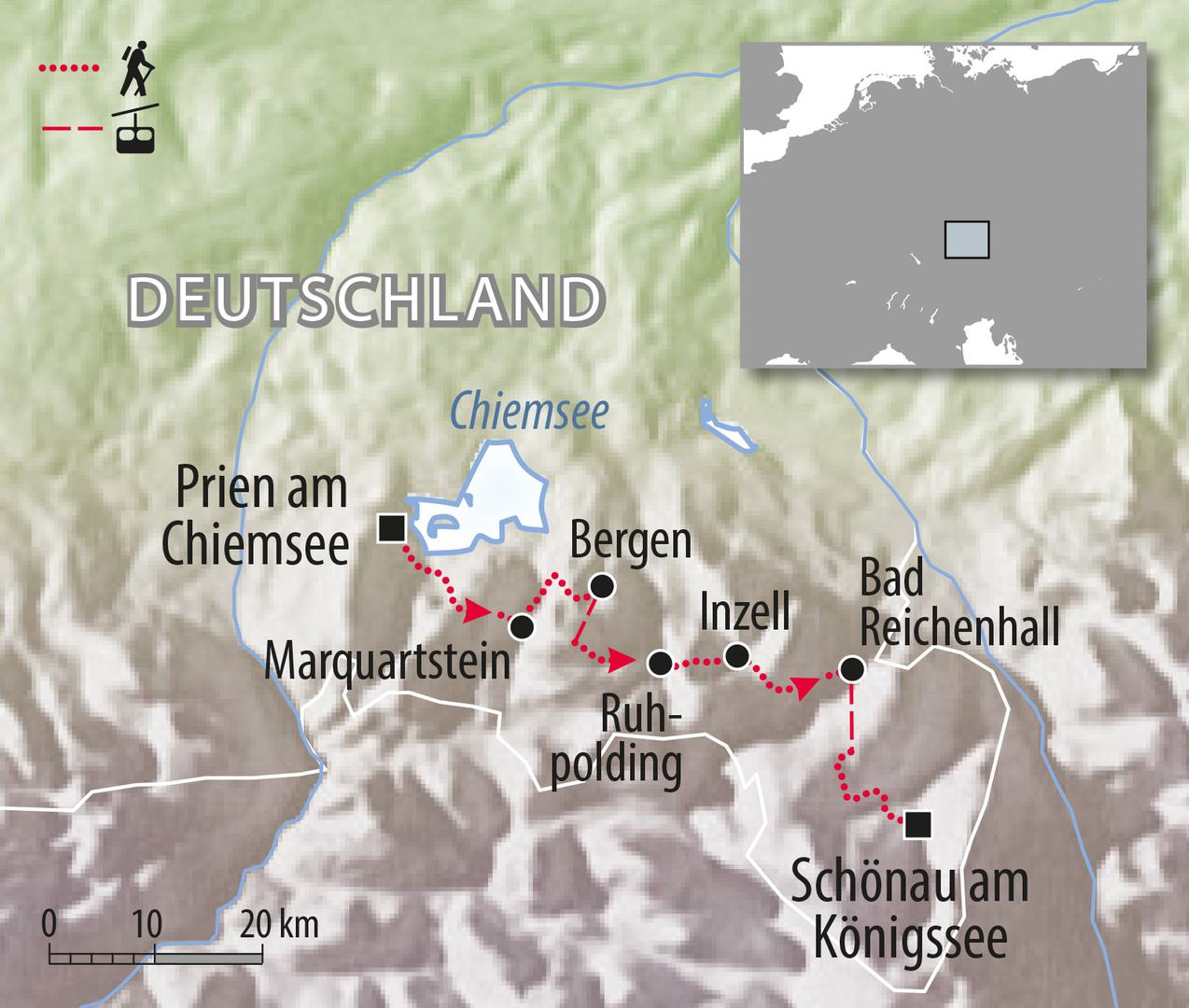 Der Salzalpensteig ist ein noch recht junger Fernwanderweg, der sich bereits kurz nach seiner Eröffnung im Jahr 2015 in die Liste der schönsten Wanderwege Deutschlands einreihte. Der Weitwanderweg in Bayern vom Chiemsee bis zum Königssee bietet Ihnen auf dieser Etappe ein abwechslungsreiches Landschaftsbild. Lieblichen Ufern folgen historische Salz- und Salinenorte und kantige Gebirgswände in den Chiemgauer Alpen und dem Steinernen Meer. Grünblaue Bergseen, malerische Naturschutzgebiete und viel Wissenswertes über das weiße Gold begleiten Sie auf der Wanderung.